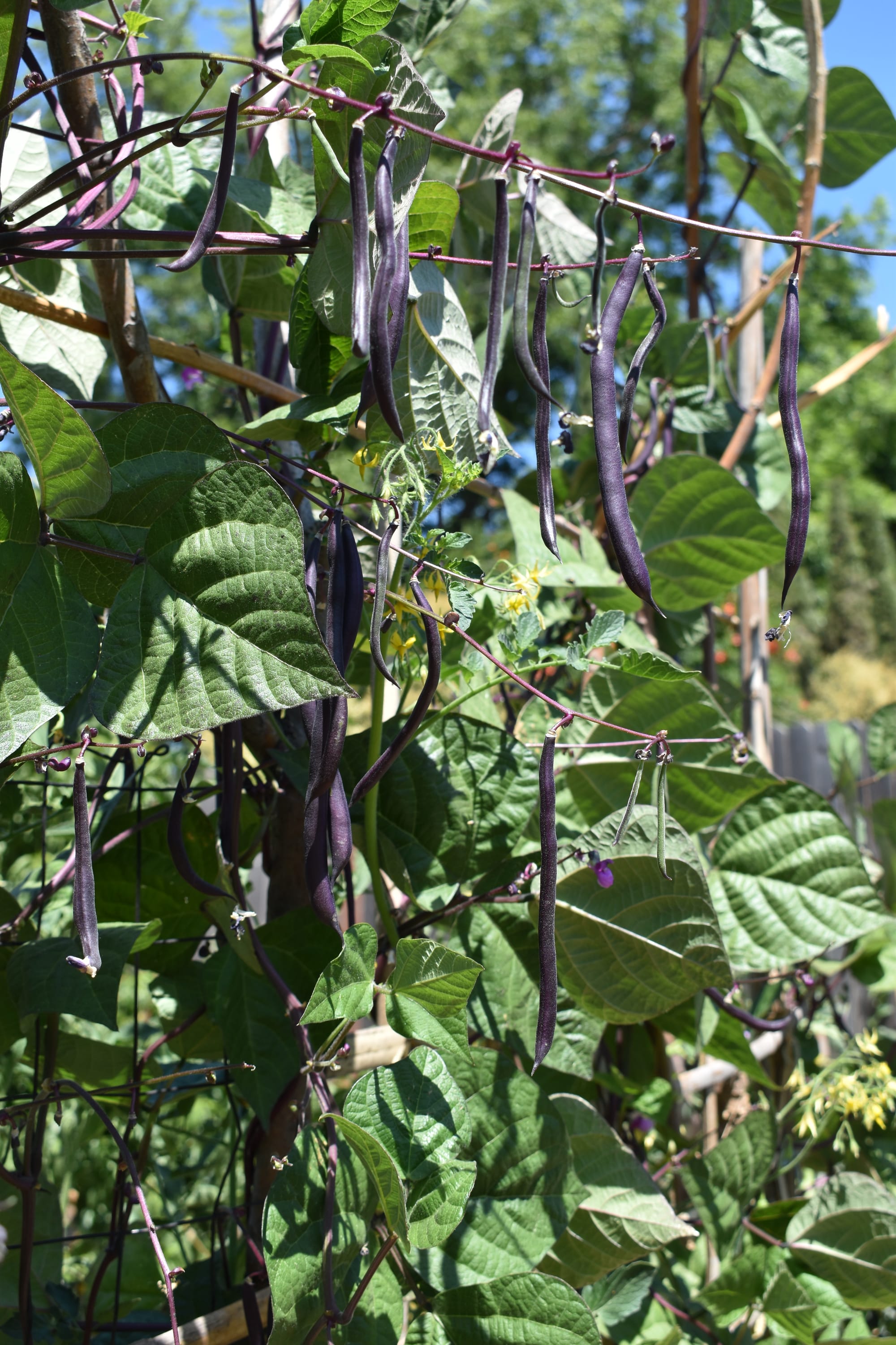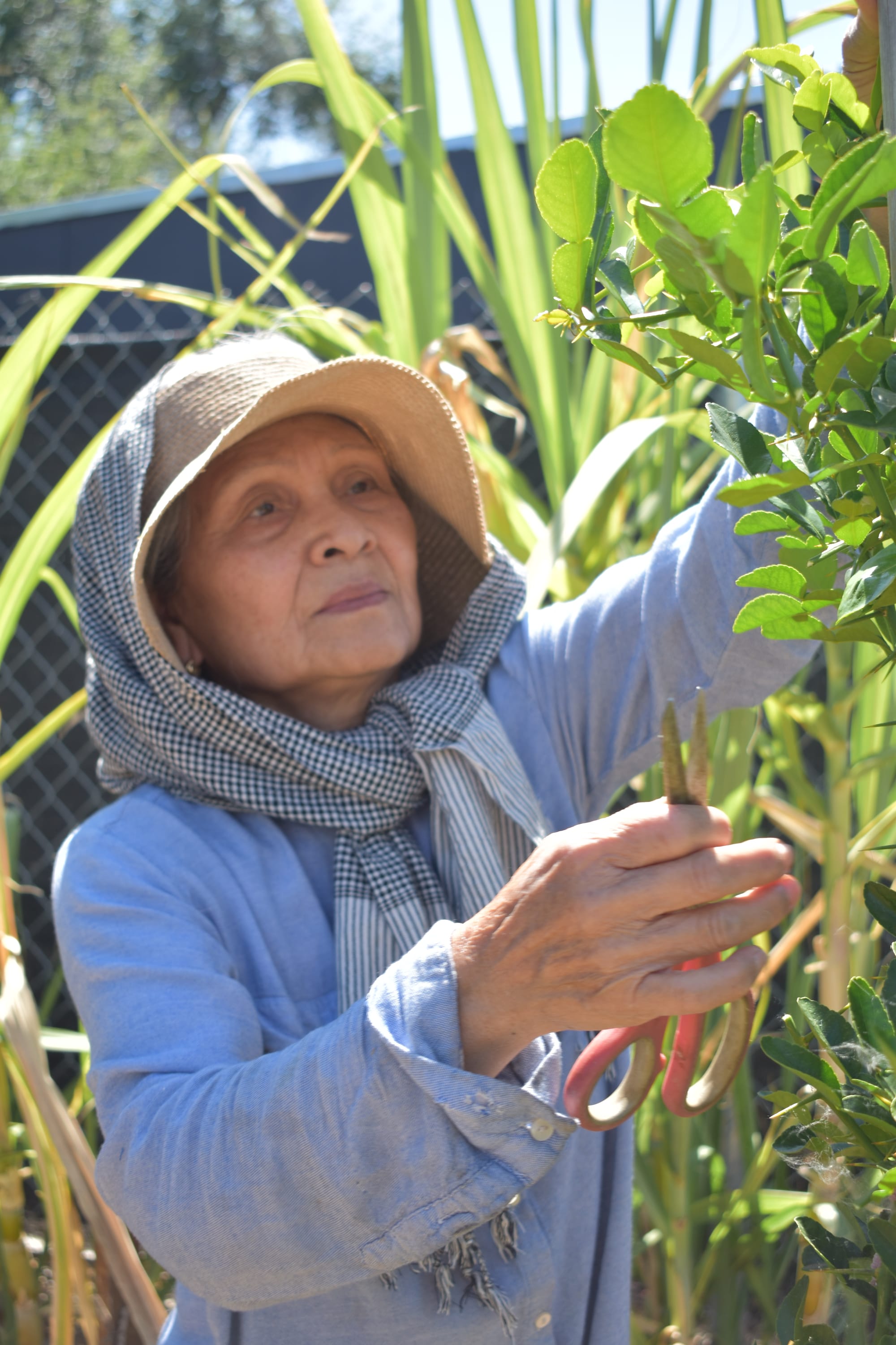 Mom harvesting kaffir lime leaves and purple beans.