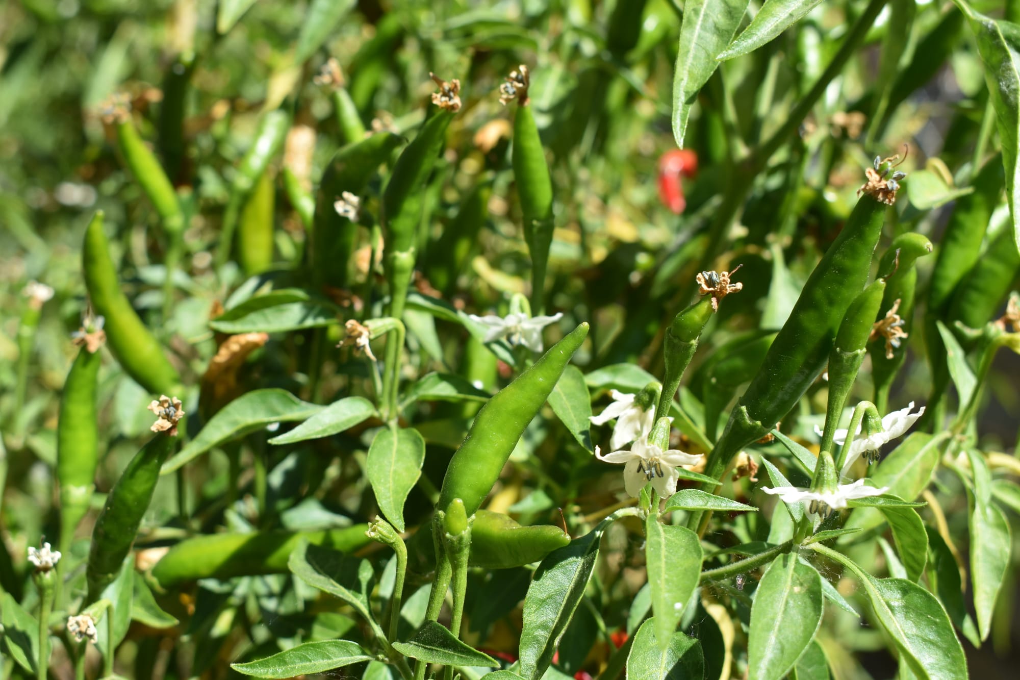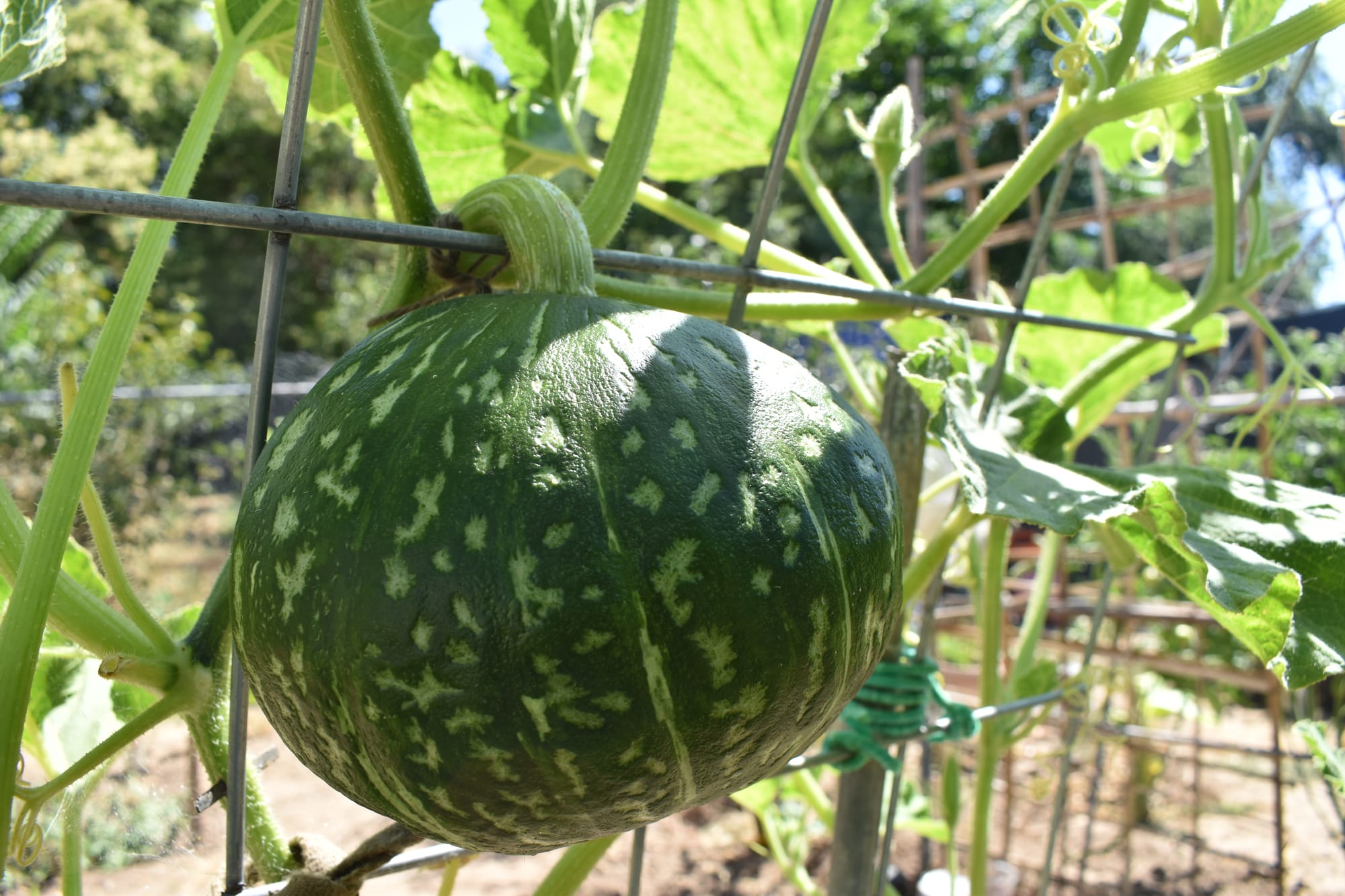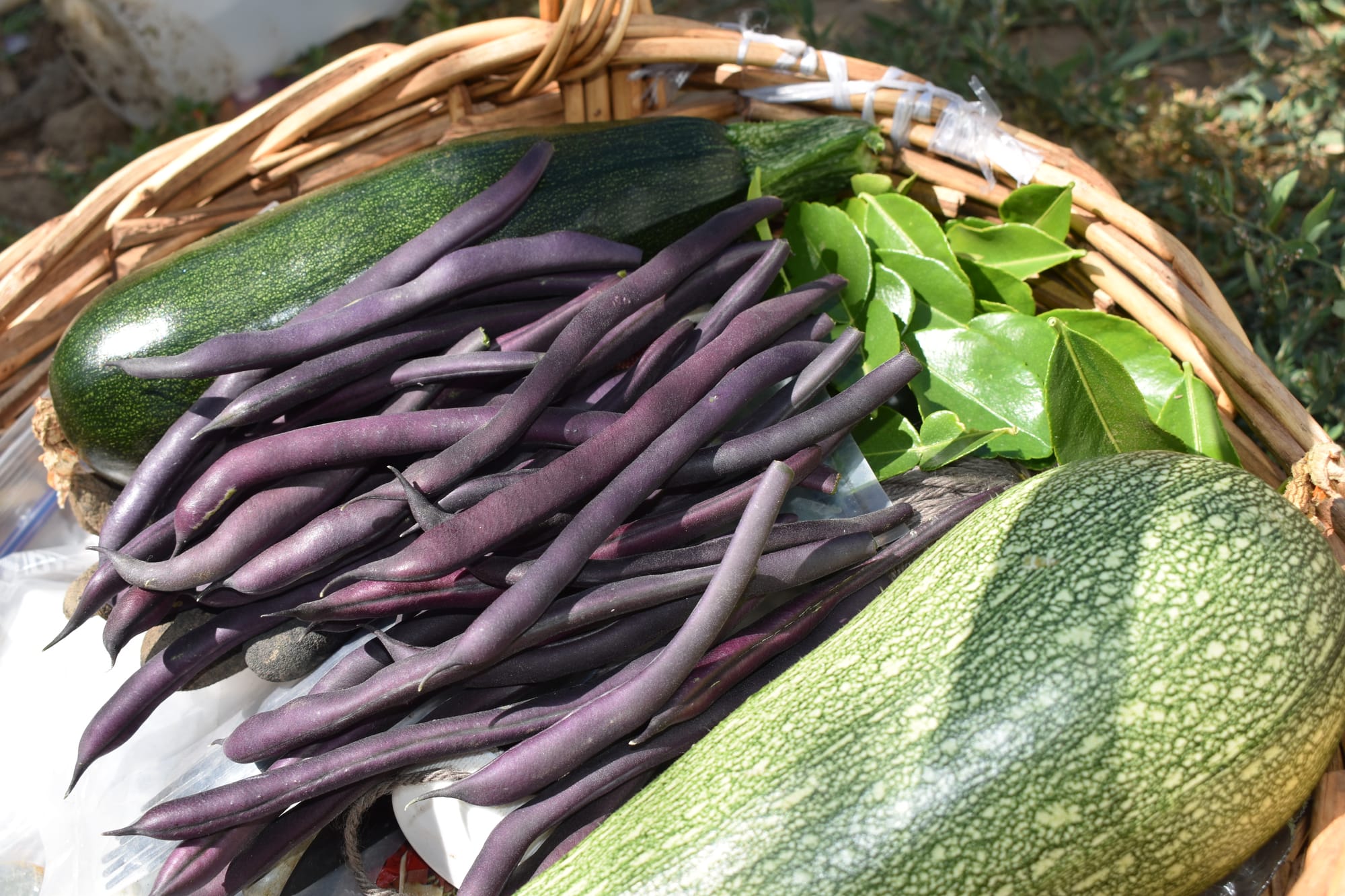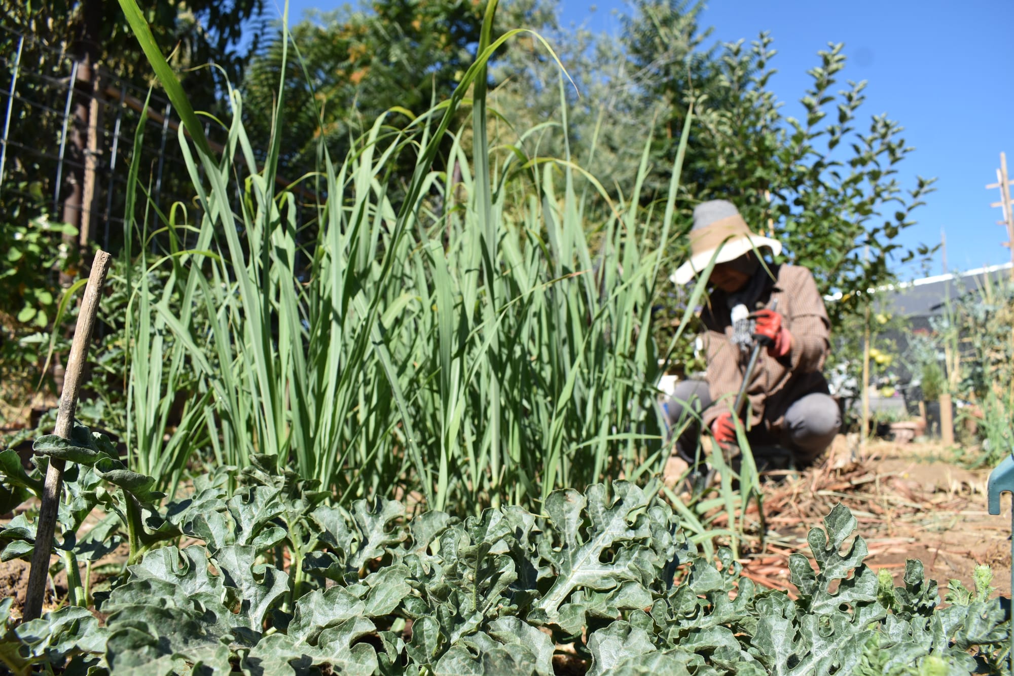 July 2025. Things my mom planted including: lemongrass, watermelon, zucchini, purple beans, Kaffir lime leaves, chili peppers, kabocha, and chrysanthemum.